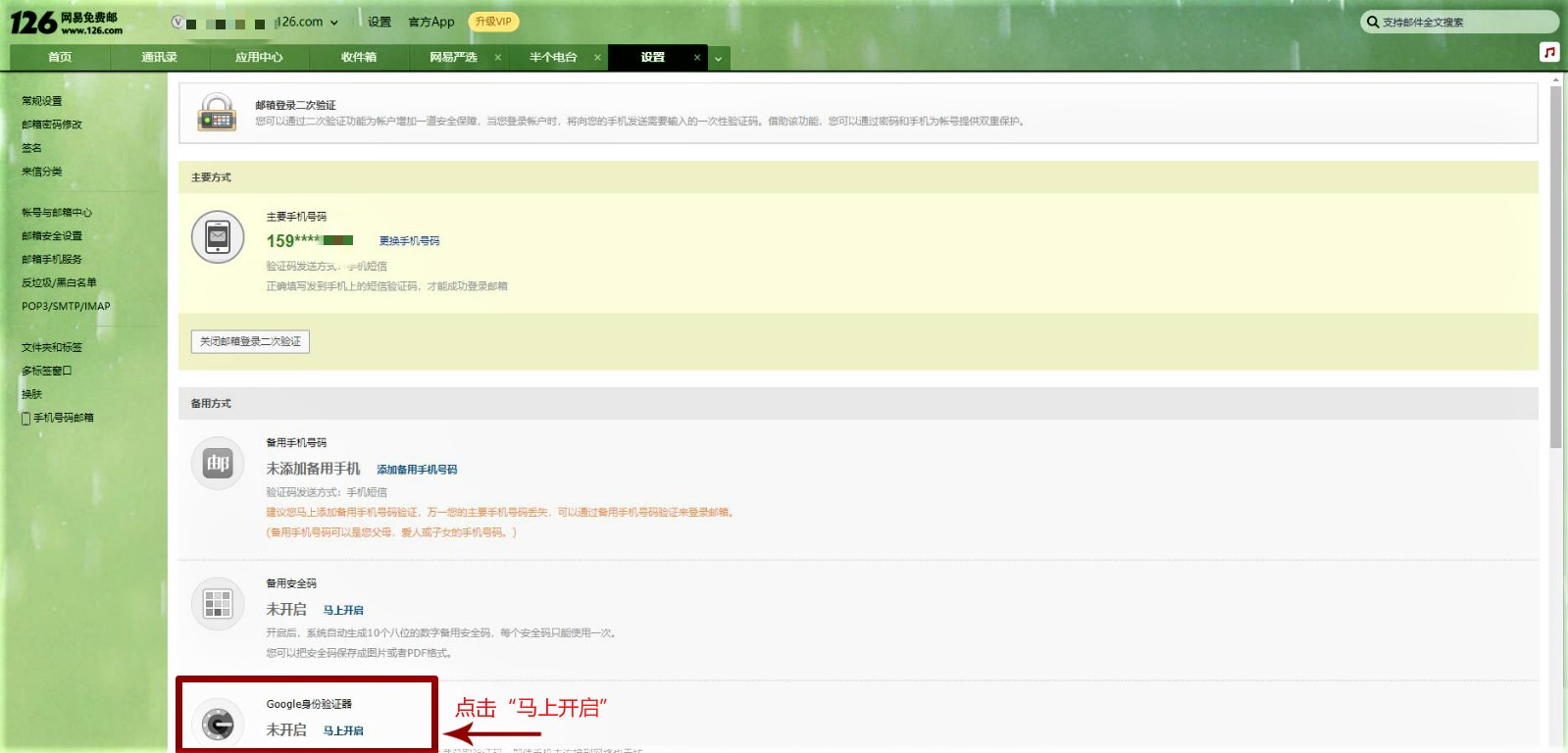 5. 在开启二次验证功能之后,找到Google身份验证器一栏之后,在相应位置点击“马上开启”