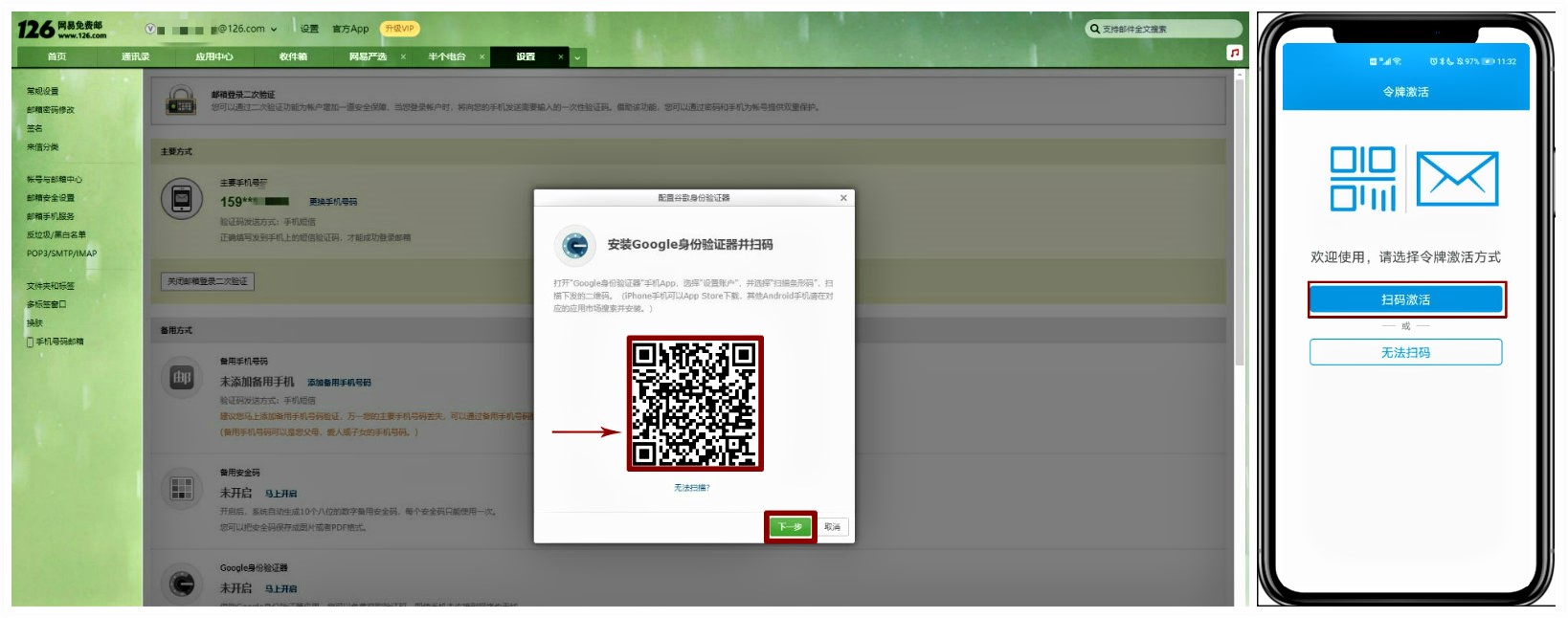 6. 用宁盾令牌/微信小程序令牌替代Google身份验证器扫描该二维码,然后点击下一步