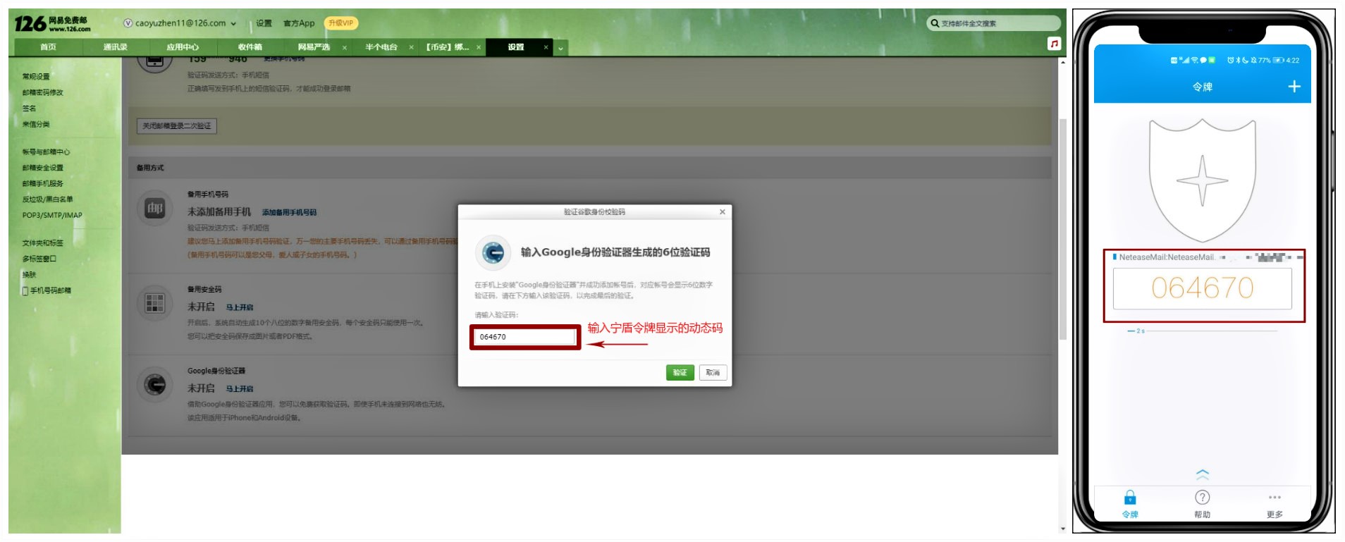 7. 输入宁盾令牌中的6位动态码后点击验证,成功设置Google身份验证器